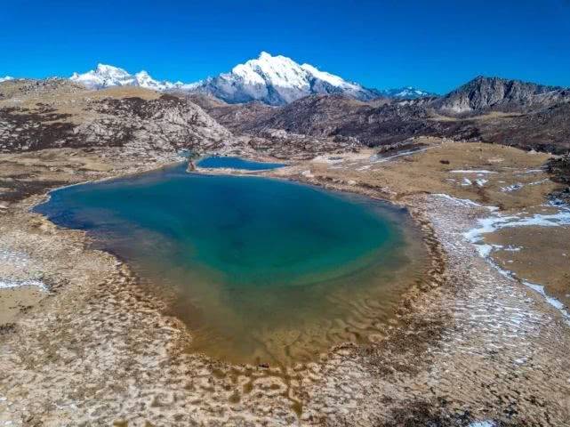 从玉石海向东1公里多,就是雅拉措和镇郎措这两个姐妹湖,比玉石海略小,湖边没啥植被,四周被雪山包围着。这里的水,雅拉措向南流出,成了雅拉河的源头,而镇郎措向北流向丹巴的小金川,南辕北辙但最后终究都汇入了大渡河。积雪的时候,姐妹湖附近光秃秃的很刺眼睛,必须戴好雪镜。