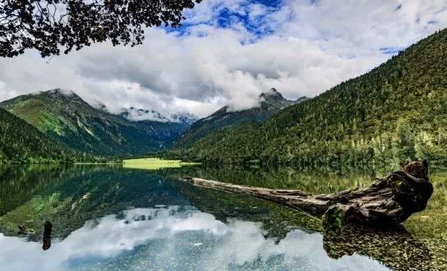 伍须海是个冰碛湖,不到1平方公里的湖面清澈甘洌,湖水中倒伏着千年的古木。3500海拔的四岸环抱着整齐的原始针叶林,远处雪山的倒影映入湖中,南面是有着美丽传说的十二姐妹峰。湖岸上还有着数千亩的天然草场。